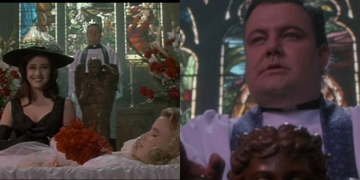 El padre Ripper no es uno de los personajes más importantes de la película, pero sus escenas son memorables. Son varias las escenas funerarias por las muertes que se producen, y es él quien se encarga de todas ellas.
