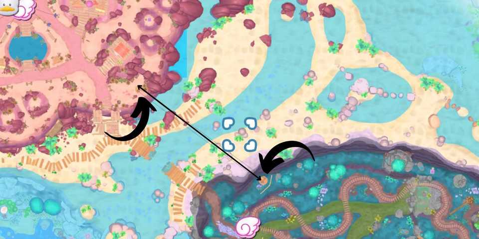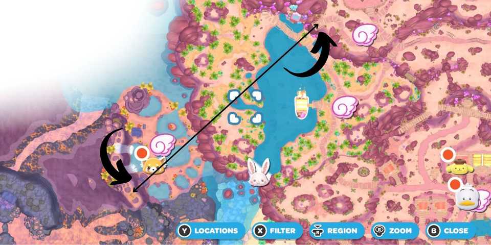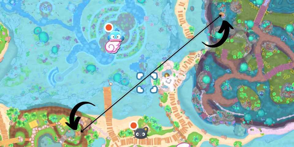 Tenga en cuenta que el Las tirolinas se pueden tomar en cualquier direcciónasí que independientemente del lado que estés, puedes usarlos. Además, si alguna vez tiene problemas para encontrarlos u olvidar a dónde conducen, puede abrir su mapa y verlos. Solo busque dos cables que conecten las áreas en el mapa en Hello Kitty Island Adventure.