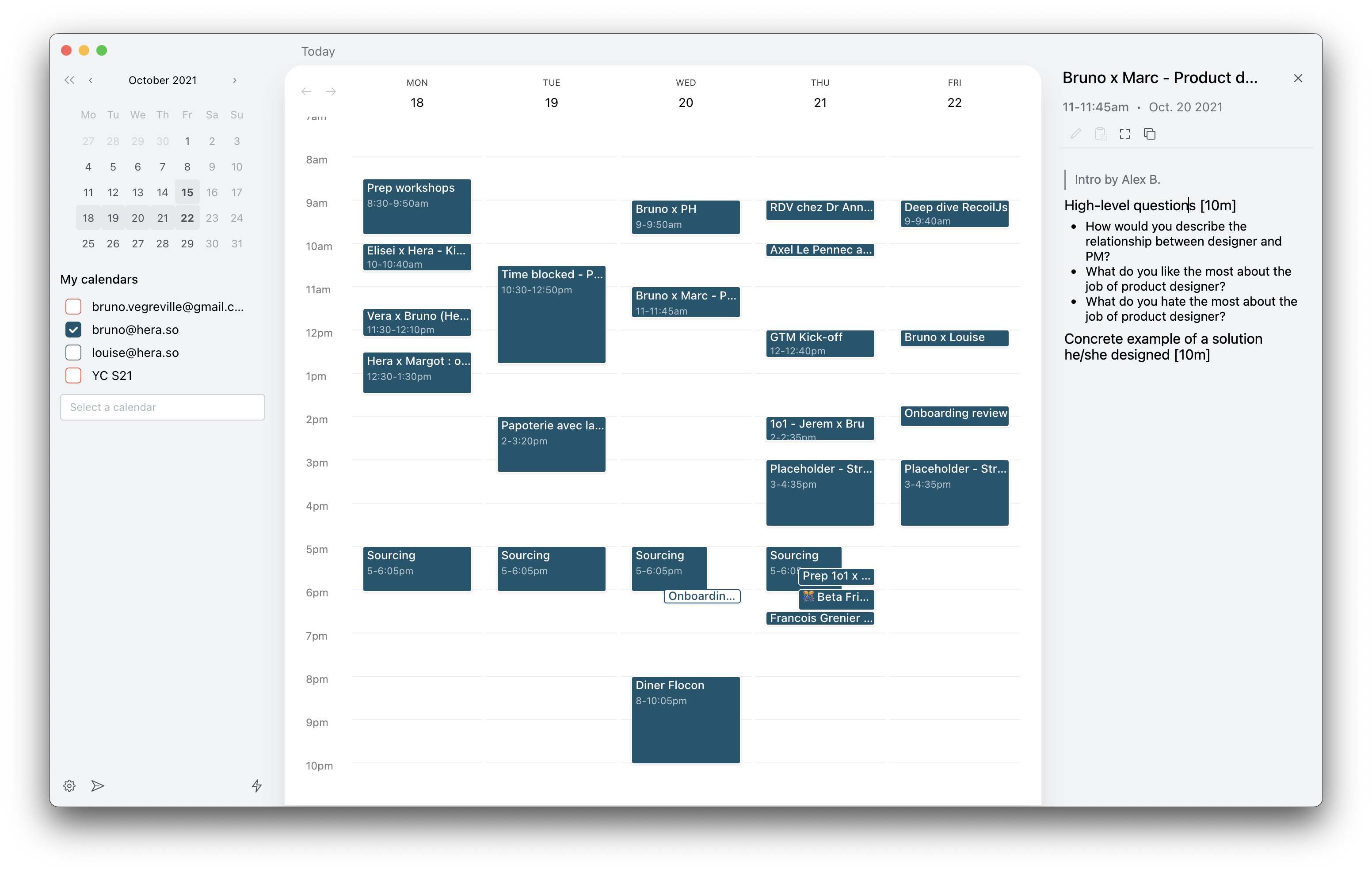 Hera comenzó como una aplicación de calendario centrada en la toma de notas durante las reuniones. Desde que asistí a Y Combinator, el producto ha evolucionado bastante. Ahora se centra en gestionar todo el ciclo de vida de un evento para personas ocupadas que gestionan muchas reuniones (virtuales).