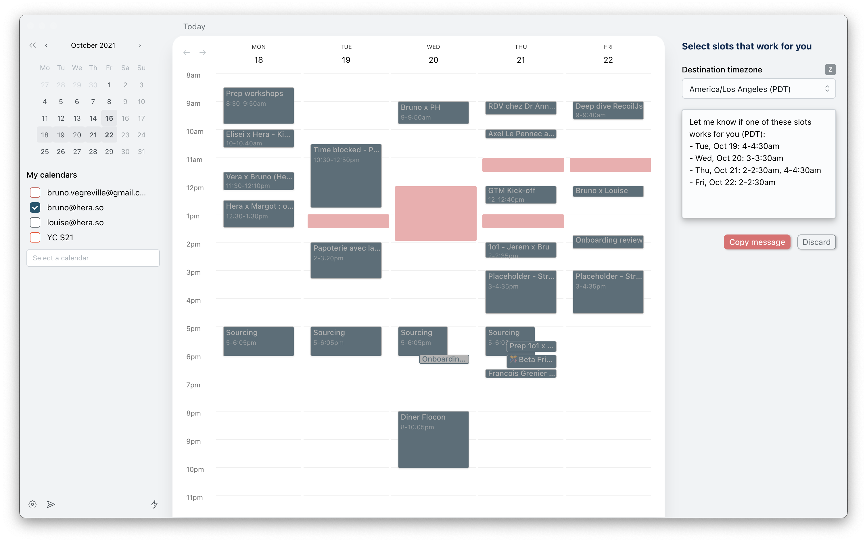 Primero, Hera puede ayudarlo a programar una reunión y prepararse para una reunión. Con solo unos pocos clics, puede seleccionar varias ranuras. Luego, Hera genera un texto amigable que puede copiar y pegar en un hilo de correo electrónico, en una conversación de WhatsApp o donde sea que esté hablando de su próxima reunión.