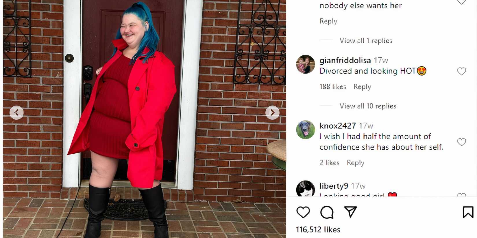 En Enero, amy recurrió a Instagram para publicar una serie de fotos de ella vestida de rojo, posando afuera en la nieve. En las fotos, el adelgazado Hermanas de 1000 libras La estrella lucía un largo cabello azul recogido hacia atrás de su rostro. un minivestido rojo vino ceñido al cuerpo, un abrigo rojo y botas negras de tacón alto hasta la rodilla. En cada foto, ella posaba, sonreía y se lo pasaba genial mostrando su cuerpo esbelto y su nuevo y divertido estilo.