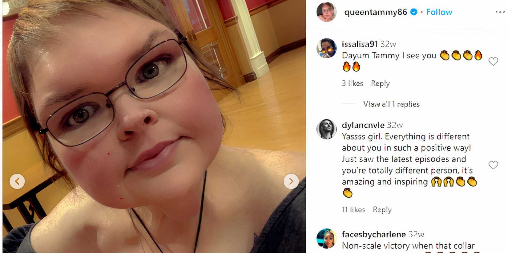 Ahora que Tammy ha perdido nada menos que 225 kilos, puede sentarse en un asiento de coche normal e incluso usar el cinturón de seguridad, lo que significa que puede conducir sola. En enero, una niña adelgazada Tammy publicó una foto con muchos filtros de ella misma sentada en un asiento de automóvil con Su rostro bañado por la luz dorada del solEn la foto, Tammy hizo pucheros mientras usaba sus característicos anteojos y un maquillaje de buen gusto.