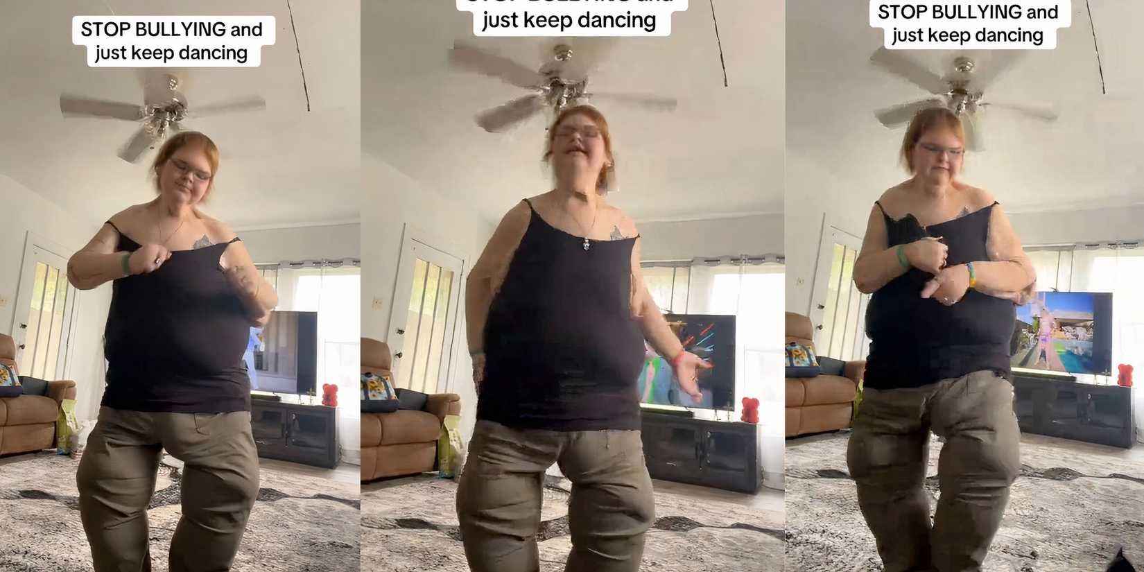 Tammy parecía feliz sosteniendo a su gatito en sus manos con cuidado mientras se balanceaba suavemente al ritmo de la música que provenía de su televisor. La casa tenía una amplia alfombra gris con círculos concéntricos y un sofá de cuero marrón, que se podía ver al fondo, junto a la consola de televisión negra y un gran televisor colocado sobre ella. La sala de estar era luminosa y estaba llena de luz natural que entraba por grandes ventanales de piso a techo detrás de Tammy, quien estaba bañada por la luz mientras bailaba “CAN’T STOP THE FEELING” de Justin Timberlake.