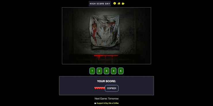 Día de puntuación más alta presenta un nuevo lote de capturas de pantalla para nombrar todos los días, y cada día parece centrarse en un género diferente de videojuegos. Por ejemplo, los títulos de hoy son todos juegos de terror de la larga historia del género. Sin revelar ninguno de ellos, las respuestas incluyen un clásico de culto absurdo junto con uno de los juegos más controvertidos jamás creados. Día de puntuación más alta parece haber sido creado por una sola persona, y aunque su nombre no aparece en la página, los fanáticos pueden seguir High Score Day en las redes sociales y donar a su desarrollador a través de Ko-fi.