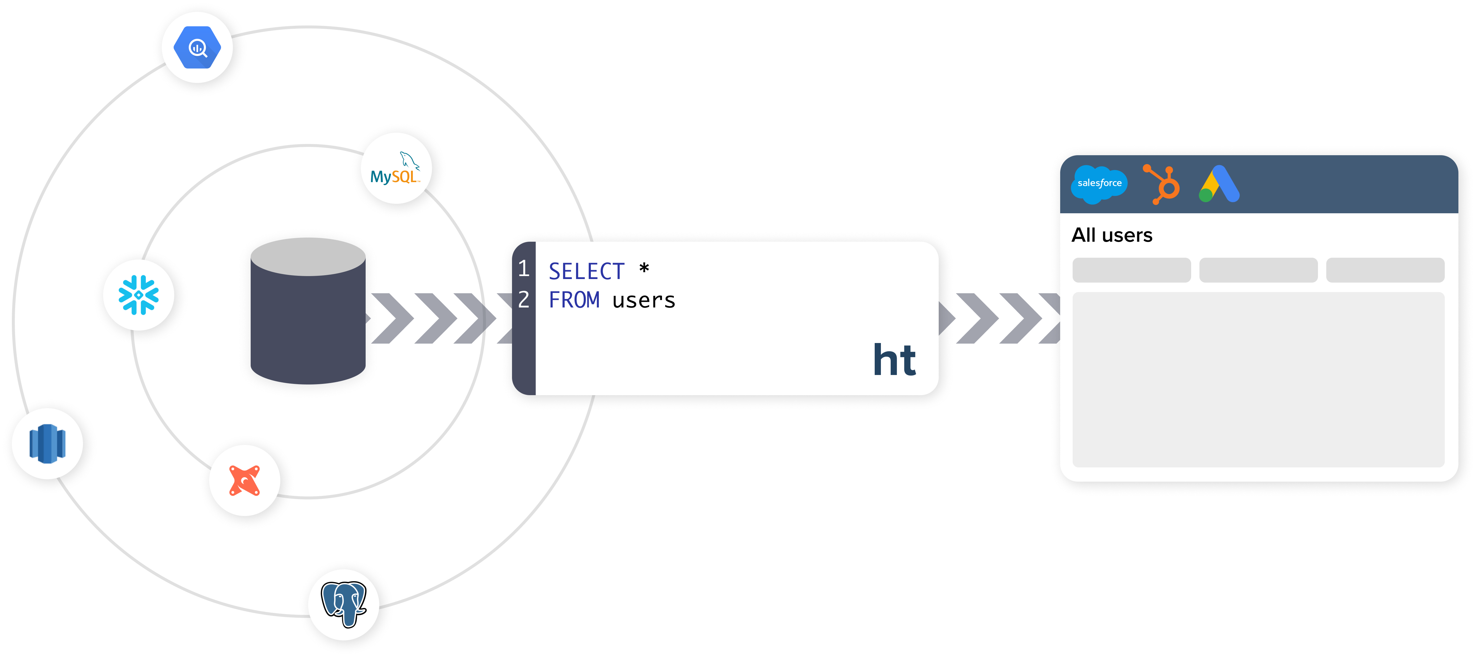 En cuanto al producto en sí, Hightouch permite a los usuarios crear consultas SQL y luego enviar esos datos a diferentes destinos, tal vez un sistema CRM como Salesforce o una plataforma de marketing como Marketo, después de transformarlo al formato que espera la plataforma de destino.