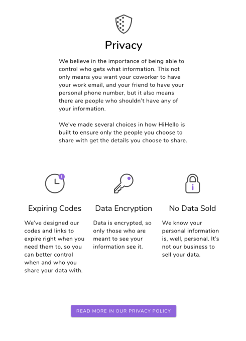 La puesta en marcha está adoptando un enfoque de la privacidad diferente al de Plaxo, y dice que no enviará correo basura ni venderá datos de los usuarios, ni pedirá permiso para acceder a sus contactos. En cambio, HiHello actuará como un proveedor de la libreta de direcciones cuya base de datos de contactos puede agregar a su dispositivo. Esto lo mantiene aislado y separado de otras fuentes de direcciones, y asegura que no "arruinará" a sus propios contactos en el proceso.
