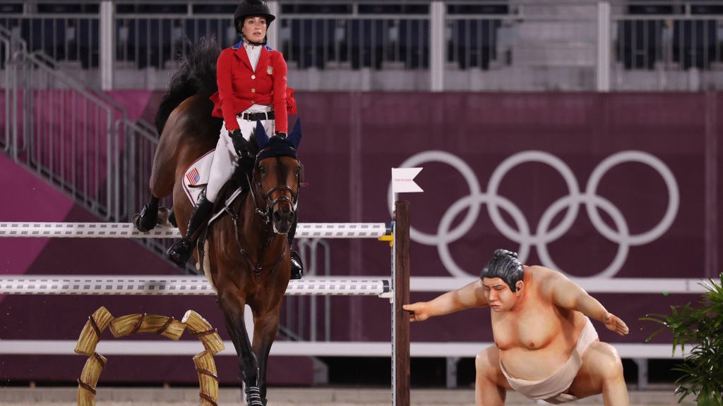 Los competidores de equitación giran alrededor de una pista de salto con una decoración claramente japonesa: los obstáculos estaban adornados con luchadores de sumo de tamaño natural, kimonos de geisha, flores de cerezo e incluso una recreación en miniatura de un palacio japonés. Pero a los jinetes de salto no les gustan las sorpresas. Tampoco a sus caballos, a los que evitar los sustos les toma años de entrenamiento.
