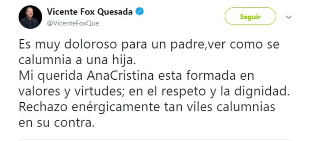 En su cuenta de Twitter @VicenteFox, el exmandatario secundó las declaraciones de su hija y dijo que era muy doloroso para un padre ver cómo se calumnia a su hija.