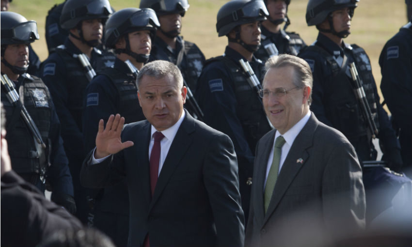• El exsecretario de Seguridad, García Luna con el entonces embajador de EU en México, Earl Anthony Wayne. Diciembre 2011. Foto: Cuartoscuro/Moisés Pablo.