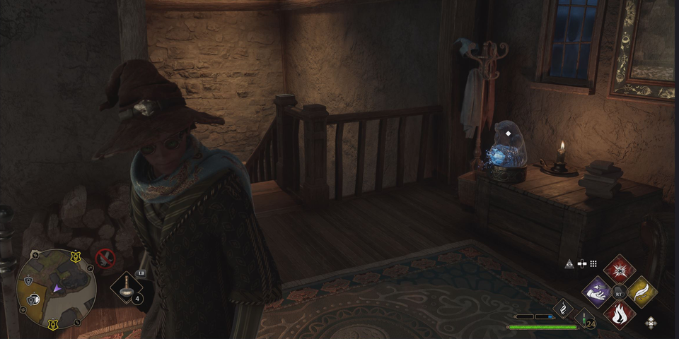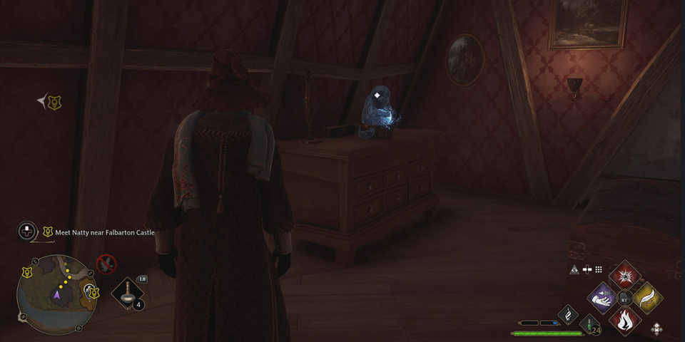 En el centro de la ciudad se encuentran las tres escobas. Viajar hasta el piso superior, donde habrá un Nivel 1 bloqueado puerta que requiere Allohomora 1. La estatua estará sobre la mesa en el centro de la habitación. |