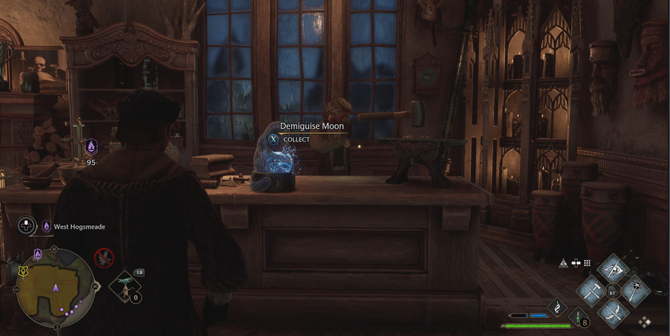 La primera estatua de semidioses que los jugadores pueden encontrar es en el edificio Tomes and Scrolls en la entrada sur de Hogsmeade. En el minimap, parece estar ubicado al lado del edificio real con el vendedor Thomas Brown. Sin embargo, yendo detrás del mostrador revelará una puerta que conduce a la habitación donde se encuentra la estatua. |