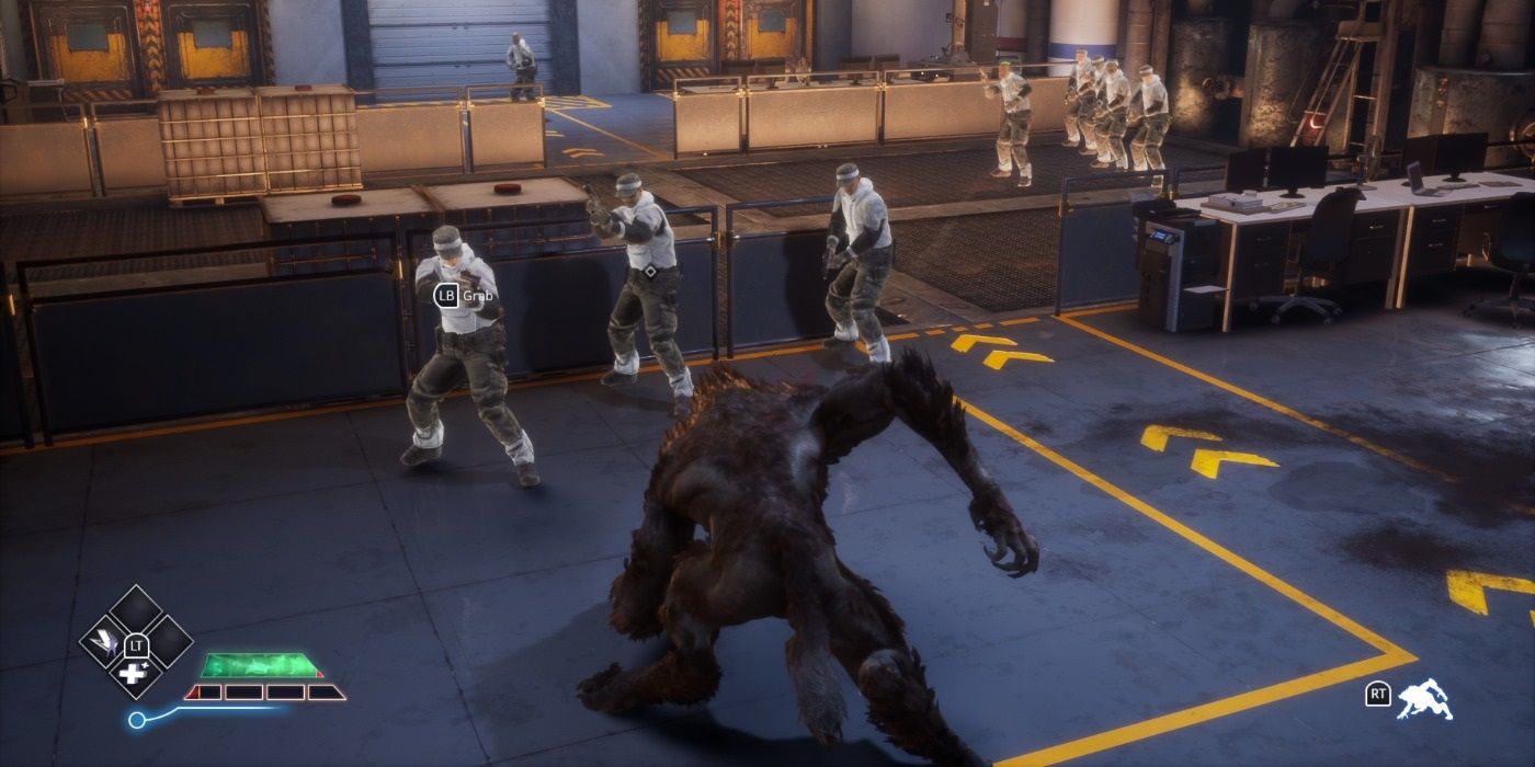 “/> Esta es una idea interesante en concepto, pero se desmorona en la ejecución. El juego de sigilo apenas funciona debido a la ubicación de los enemigos y a que cada sección está dividida en áreas pequeñas donde todos están a la vista unos de otros. El jugador tendrá suerte si logra derrotar a un enemigo antes de que las alarmas comiencen a sonar y llegue el momento de Crinos. Afortunadamente, las batallas son experiencias divertidas al estilo beat-em-up. La forma Crinos puede cambiar entre la postura ágil y la postura pesada para cambiar el enfoque entre movilidad y daño.