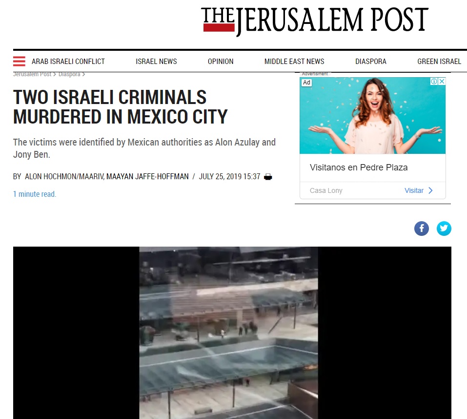 En su nota titulada “Dos criminales israelíes son asesinados en la Ciudad de México”, el diario precisa que “los infames criminales Alon Azulay y Jony Ben han sido identificados por autoridades mexicanas como las víctimas”.