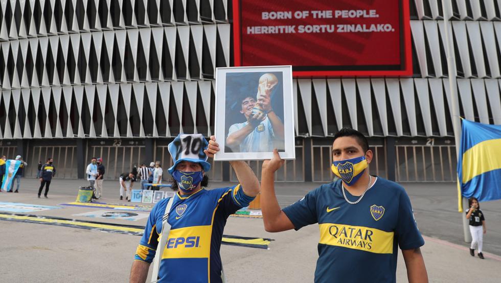 Un grupo de medio centenar de aficionados argentinos, convocados por la peña de Boca Juniors ‘La Bombonera Vasca’, ha realizado un homenaje hoy a Diego Armando Maradona en las puertas de San