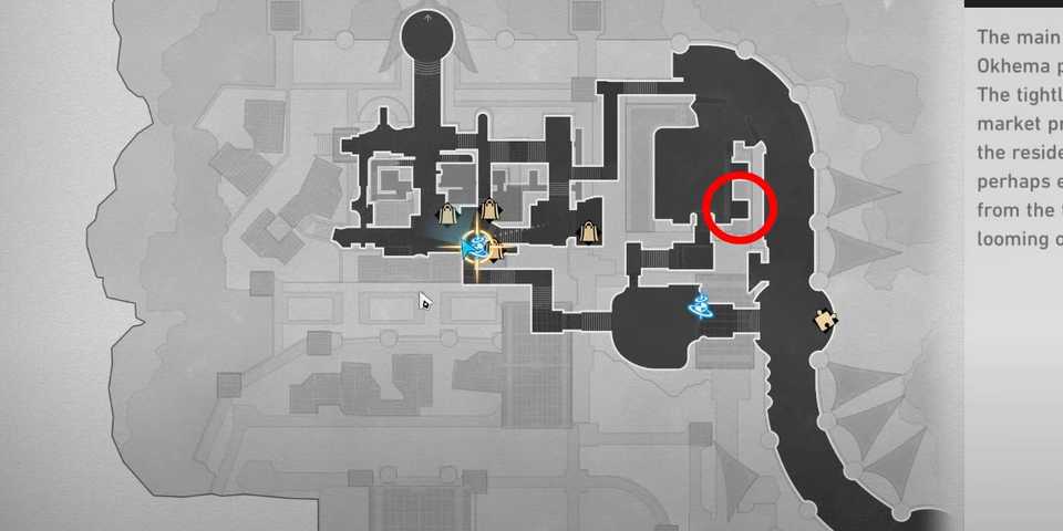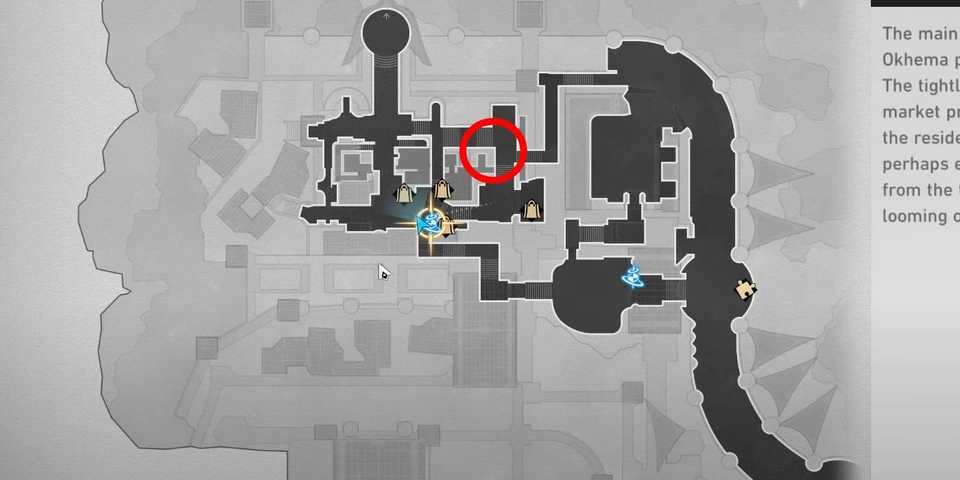 En el segundo piso del sudeste de Okhema, a lo largo de los tejados. Desde el punto de teletransportación, busca las escaleras que conducen al techo y dirígete a la esquina noreste del área. Aquí, Destruye un escudo flotante con ojos llameantes.luego retrocede el tiempo para revelar la Llama. |