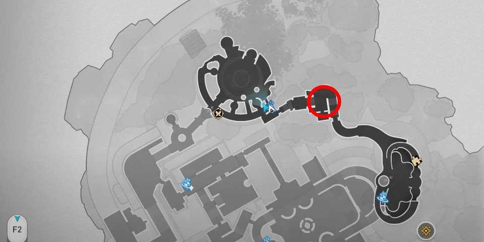 Sube desde el punto de teletransporte, luego gira bruscamente a la izquierda y sigue el camino que tienes delante. Entre el Baño Desbordante y el Tribunal de las Estaciones, deberías encontrar otra Llama rota que puedas arreglar. |