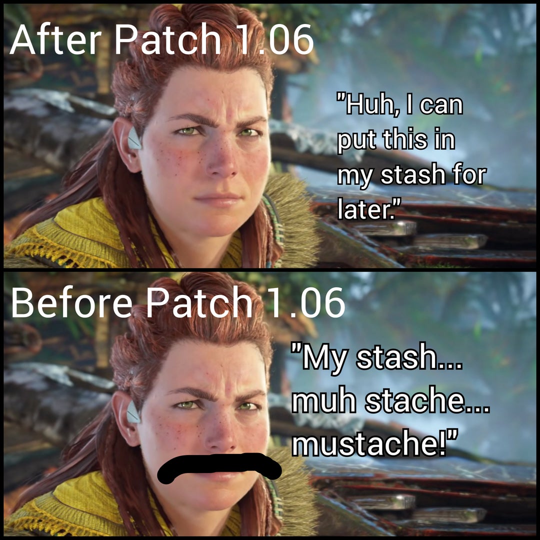 Una vez que los diseñadores arreglaron el parche, la obsesión de Aloy con su alijo disminuyó significativamente y los jugadores se volvieron mucho más felices. Por supuesto, el póster lo hace mejor al agregar un bigote en la cara de Aloy, jugando con el doble sentido del acento de Aloy cuando pronuncia “mi escondite” una y otra vez en el juego.