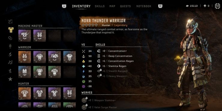 El Nora Thunder Warrior es el conjunto imprescindible para los jugadores que se aventuran en Horizonte Prohibido Oeste. La armadura está enfocada a distancia con el daño de impacto más alto entre las armaduras legendarias mientras mejora enormemente la concentración. También es muy flexible en la batalla con habilidades para la regeneración de la resistencia que aumentan la cantidad de veces que el jugador puede esquivar y armas pesadas que mejoran aún más las armas de dos manos.