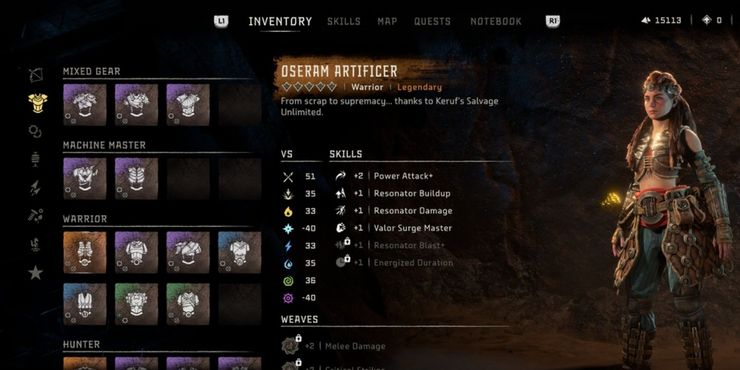El Oseram Artificer es la armadura cuerpo a cuerpo de facto que aprovecha la lanza renovada de Aloy en Horizonte Prohibido Oeste. La armadura tiene las estadísticas cuerpo a cuerpo más altas del juego cuando se actualiza por completo y habilidades que aumentan los ataques cuerpo a cuerpo y de poder al mismo tiempo que aumentan la acumulación de resonador y el tiempo que los enemigos permanecen energizados. Además, cuando la armadura se combina con la oleada de valor del escudo superior, el jugador es casi invencible con un escudo de relleno que se encoge de hombros ante la mayoría de los ataques y entra rápidamente en el rango cuerpo a cuerpo.