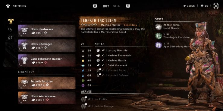 Además, cuando se actualiza por completo, la armadura tiene más daño sigiloso con golpe silencioso+ y algo de robo de vida con la habilidad de curación de golpe silencioso. Si bien la armadura es excelente para limpiar bases rebeldes y acabar con las máquinas más pequeñas, no está hecha para batallas prolongadas, especialmente contra las máquinas más grandes como Thunderjaw o Shellsnaper. La armadura Utaru Winterweave se encuentra en el vendedor de ropa en Thornmarsh y cuesta 2000 fragmentos de metal, un circulador Tremortusk y un corazón Apex Dreadwing.