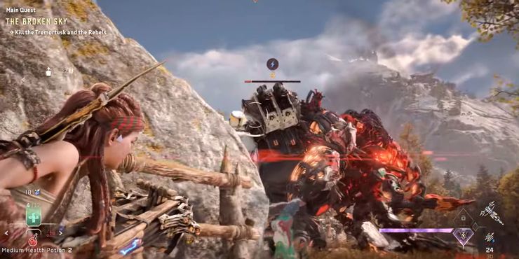 Una vez que el jefe lucha con la máquina en Horizonte Prohibido Oeste comienza, el jugador debe buscar refugio inmediatamente de los proyectiles enemigos a distancia. Asegúrate también de mantener una distancia adecuada de los ataques devastadores de Tremortusk, ya que es capaz de derribar paredes rotas y otras formas de cobertura.