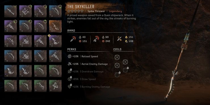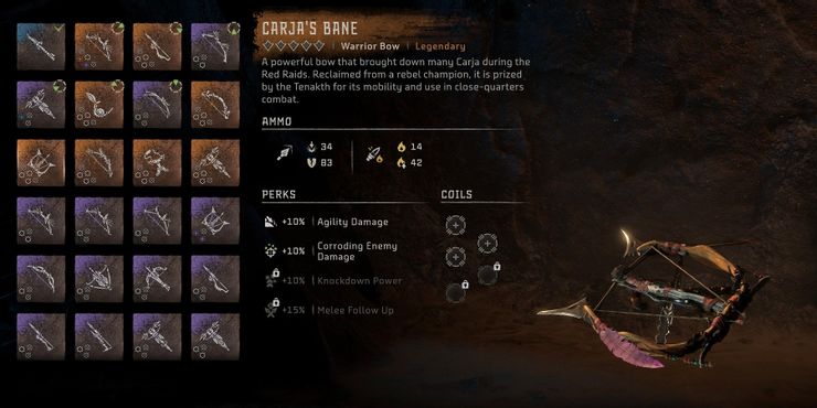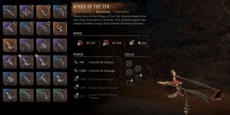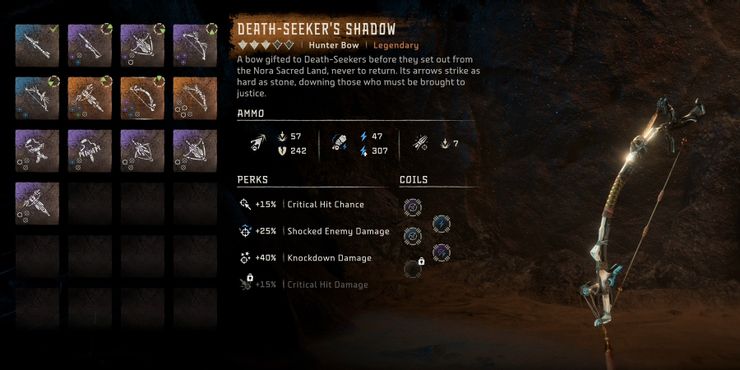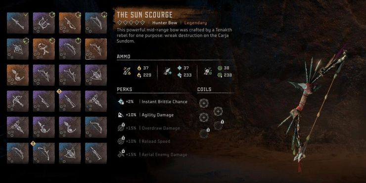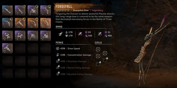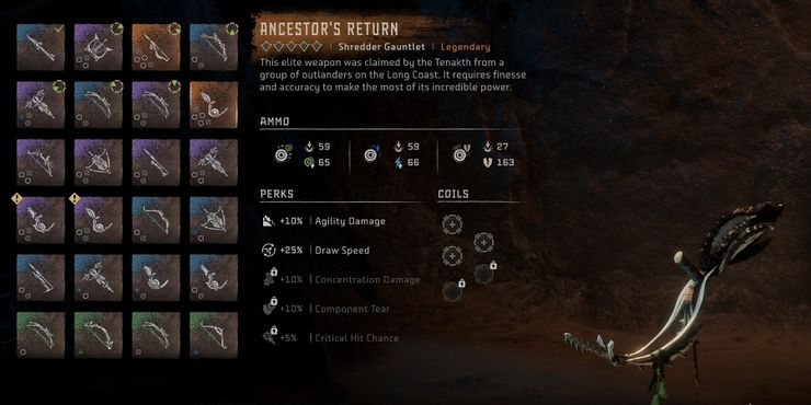 Aunque algunas de las armas legendarias pueden tardar en obtenerse, son extremadamente útiles para completar tareas más difíciles, como derrotar a jefes en Horizonte Prohibido Oeste. Algunas de las armas legendarias se pueden comprar, pero la mayoría de ellas deben desbloquearse completando misiones secundarias o reuniendo objetos coleccionables, como los adornos que se encuentran en Horizonte Prohibido OesteRuinas de la reliquia de . Obtener las nueve armas legendarias puede ser una tarea que requiere mucho tiempo.