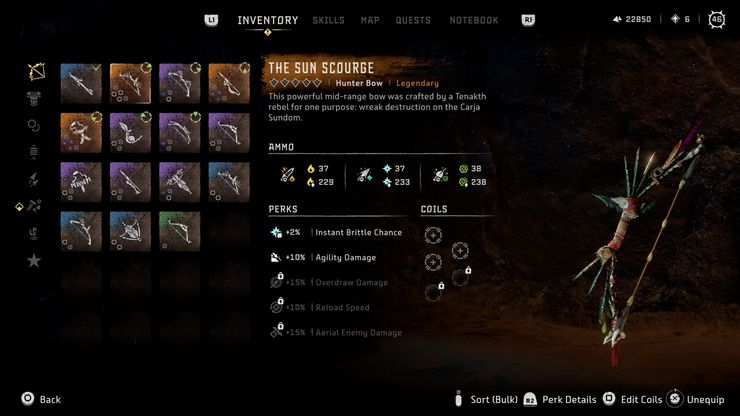 De los dos legendarios arcos de cazador en Horizonte Prohibido Oeste, La principal diferencia de Sun Scourge es su enfoque en la aplicación de efectos de estado de fuego, escarcha y ácido. Si bien el arma aplica una gran cantidad de daño elemental, tiene una velocidad de recarga relativamente lenta. El arma también deja brechas en el daño del jugador por segundo, potencialmente abriéndolo para un contraataque.