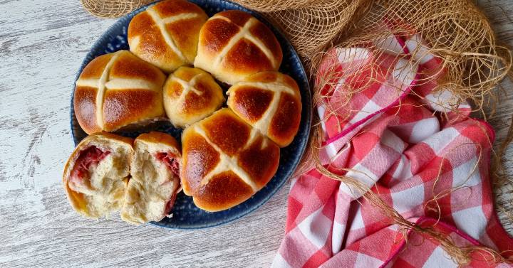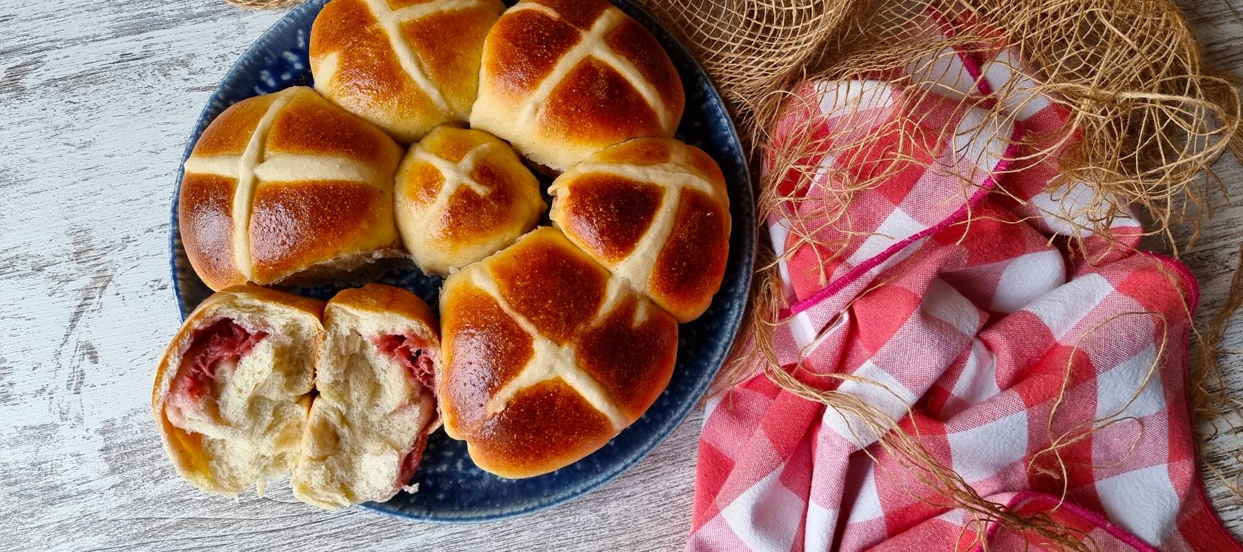 En realidad, estos bollitos originarios de Inglaterra son típicos de Semana Santa; su característica más reconocible -además de las citadas en el párrafo anterior- es esa cruz blanca que aparece encima de cada uno; mientras se cocinan en el horno todos juntos en un molde, haciendo que cada bolita de masa se pegue con la otra. ¿Por qué una cruz? Es una tradición católica del Viernes Santo, y nos podemos remontar hasta los antiguos griegos para encontrar otros dulces también marcados con cruces llenas de simbolismo.