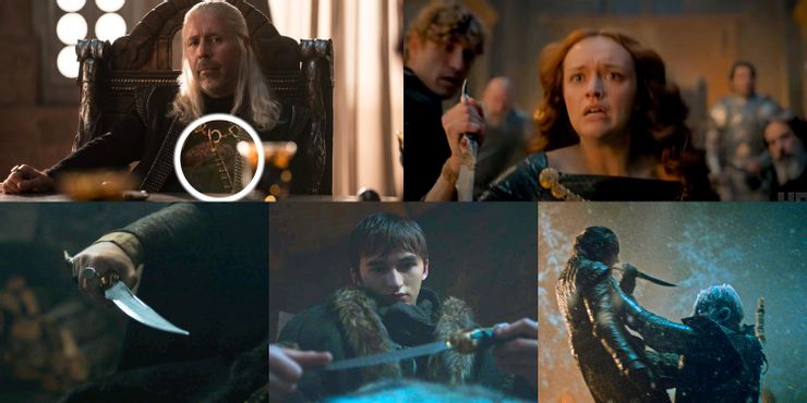 Incluso antes de matar al Rey de la Noche, Arya usa la daga para asesinar a Littlefinger, mostrando la historia sangrienta de la daga y el sentido de venganza que conlleva. Casa del Dragón se estará agregando a. Game of Thrones la temporada 7 configura este retcon, con una daga de acero valyrio similar que aparece en un libro que Samwell Tarly lee en la Ciudadela. Eso sugería que la daga tenía una historia mucho más larga, que probablemente se remontaba a los días del mismo Aegon el Conquistador; Casa del Dragón Puede que no lo confirme, pero parece estar haciendo que el viaje de esta arma sea aún más histórico.