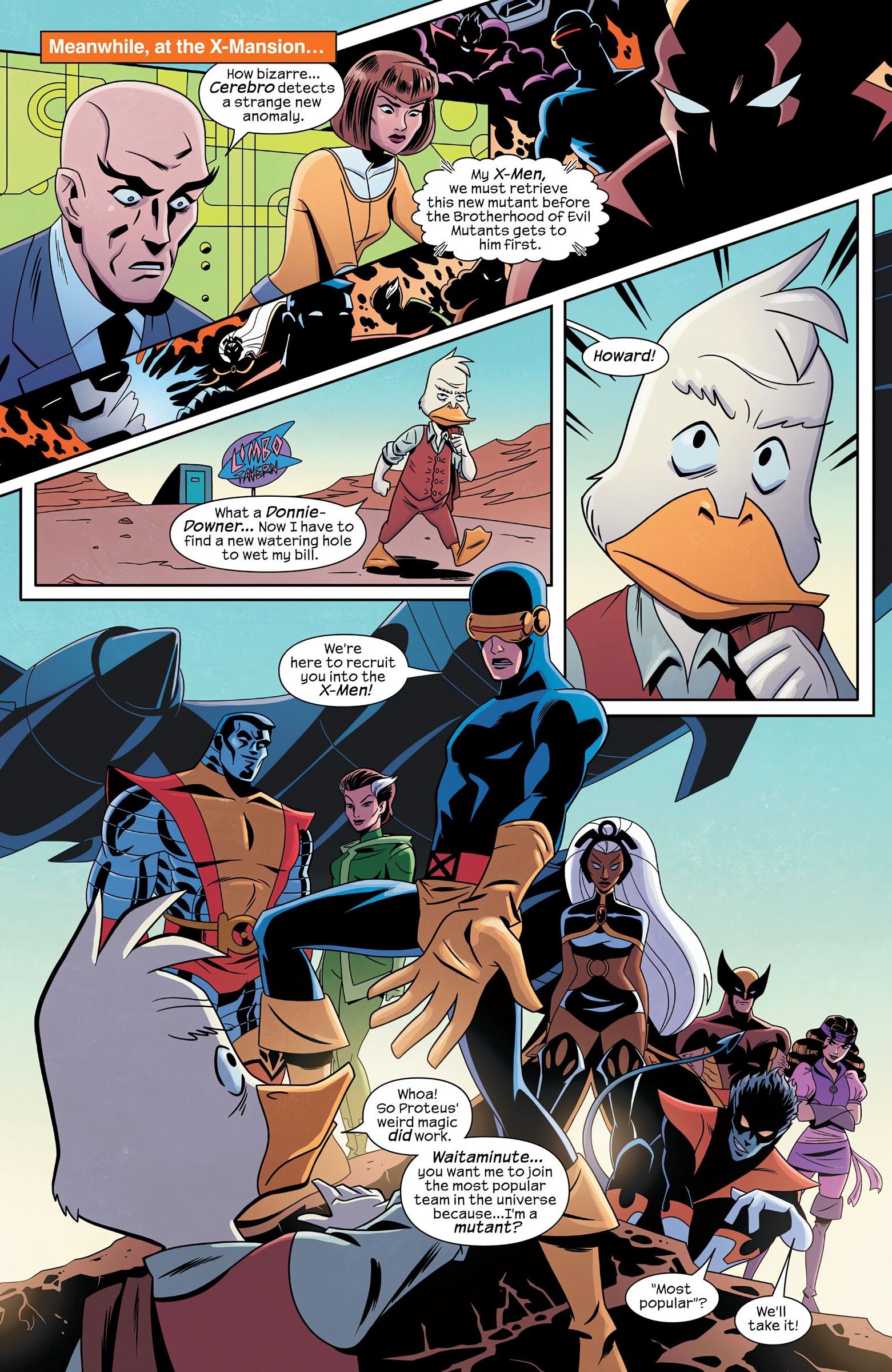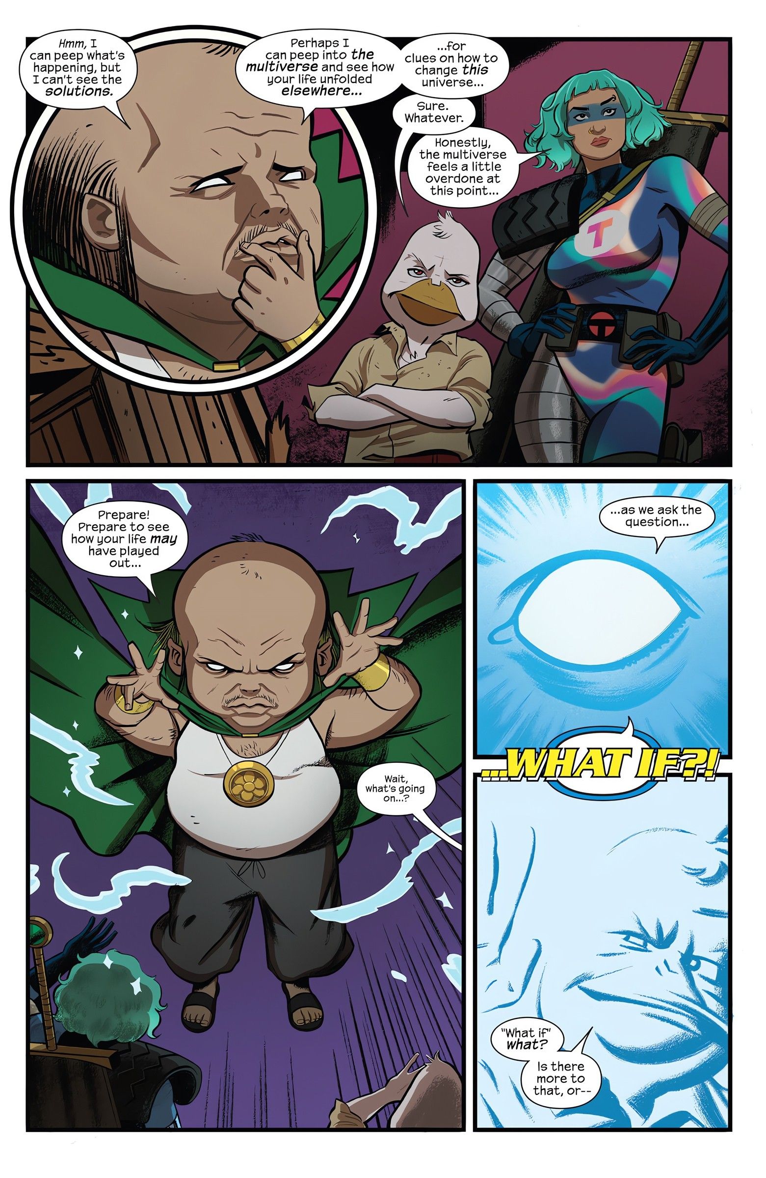Howard el pato es un número de “jam”, en el que varios creadores cuentan “¿Y si?” historias de la vida de Howard. The Peeper, una versión de bajo costo del Watcher, le ofrece a Howard vislumbres de su otro yo en todo el multiverso. Los lectores ven un mundo en el que Howard se unió a los Guardianes de la Galaxia y otro en el que ganó su infame candidatura a la presidencia. Las historias mantienen los tonos satíricos y surrealistas de las historias originales de Steve Gerber y Val Mayerik y refuerzan lo que hizo de Howard el Pato un personaje tan fascinante en primer lugar.