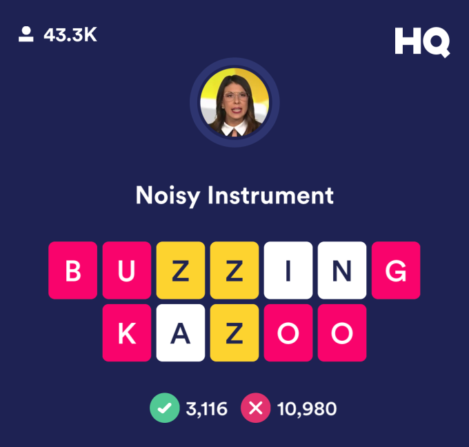 La preocupación es que, en su núcleo, Words sigue siendo bastante similar a Trivia. Ambos son juegos de conocimiento basados ​​en la eliminación y en tiempo real que se juegan contra todos por dinero. Ambos a veces sienten que usan trucos baratos para eliminarte. Un rompecabezas reciente de Words te pidió que nombraras un instrumento ruidoso, pero la respuesta no fue "kazoo" sino "kazoo zumbando", algo que no estoy seguro de que alguien haya llamado formalmente. Dado el ritmo más rápido de interacción, incluso los pequeños fallos o los momentos de retraso pueden ser suficientes para perder una ronda. Un juego beta de HQ Words a principios de esta semana no pudo mostrar el teclado a algunos usuarios, lo que provocó una eliminación masiva. La presión para que la ingeniería de HQ funcione sin fallas nunca ha sido mayor.