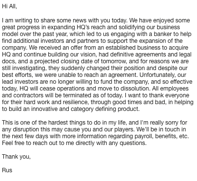 “Recibimos una oferta de un negocio establecido para adquirir HQ y continuar construyendo nuestra visión, teníamos acuerdos definitivos y documentos legales, y una fecha de cierre prevista para mañana, y por razones que todavía estamos investigando, de repente cambiaron su posición y, a pesar de nuestro mejor esfuerzo esfuerzos, no pudimos llegar a un acuerdo ”, escribe Yusupov. “Desafortunadamente, nuestros principales inversores ya no están dispuestos a financiar la empresa, y tan eficaz hoy, HQ cesará sus operaciones y se moverá a la disolución”. Todos los empleados y contratistas serán despedidos a partir de hoy “.
