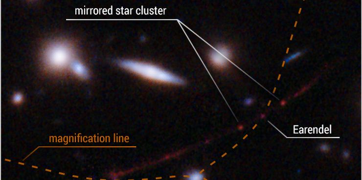 Incluso siendo una estrella tan gigantesca y su luz viajando hacia la Tierra durante miles de millones de años, el Hubble solo detectó a Eärendel gracias a un cúmulo de galaxias cercano. El cúmulo (conocido como WHL0137-08) se encuentra en algún lugar entre la Tierra y Eärendel. La enorme masa del cúmulo hace que se doble y deforme la estructura misma del espacio, creando así “una poderosa lupa natural que distorsiona y amplifica enormemente la luz de los objetos distantes detrás de ella”. Las posibilidades de que este cúmulo se alinee tan perfectamente con la Tierra y Eärendel son increíblemente raras, pero debido a eso, el Hubble ahora hizo un descubrimiento que pasará a los libros de historia.