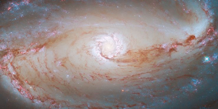 Los astrónomos conocen la galaxia que está mirando como NGC 1097. Es una galaxia espiral barrada y se encuentra a 48 millones de años luz de la Tierra. Para algún contexto, Plutón, el “planeta” más alejado de la Tierra en nuestro Sistema Solar, está aproximadamente a 0,000628 años luz de distancia. Como explica la NASA, “Esta imagen revela la complejidad de la red de estrellas y polvo en el centro de NGC 1097, con los largos zarcillos de polvo que se ven en un tono rojo oscuro”. Esta foto del Hubble en particular es tan detallada porque fue capturada no con una sino con dos de las cámaras del Hubble.