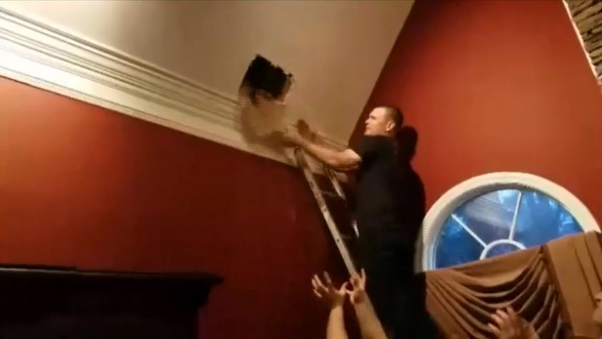 Entonces los bomberos trajeron una escalera y usaron una sierra para cortar una abertura en el techo.