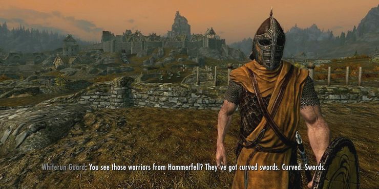 Una de las frases más escuchadas que los jugadores escucharán decir a los guardias de Whiterun de Skyrim, además de hablar de sus rodillas y flechas, se refiere a algunos visitantes extranjeros que han visto. Los guardias parecen fascinados por sus armas, lo que les lleva a decir: “¿Ves a esos guerreros de Hammerfell? Tienen espadas curvas. Curvo. espadas“Este fragmento de diálogo se ha convertido en una especie de broma entre Pergaminos mayores fanáticos, pero es interesante ya que los guardias mencionan el origen específico de estos guerreros.