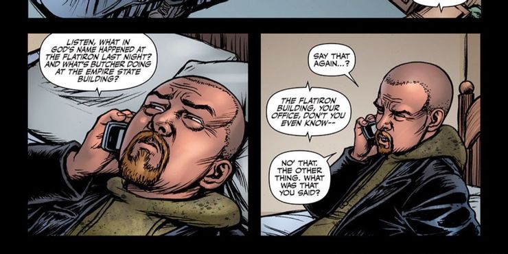 En el número, Hughie llama al encargado de la CIA de los Boys, un hombre al que burlonamente se refieren como Monkey, para que lo ayude a acabar con Butcher. Si bien inicialmente solo quiere pasar la misión de detener a Butcher a la CIA, Monkey interrumpe a Hughie y le pregunta por qué Butcher estaba en el Empire State Building durante el tiempo de su llamada. Con esa información que le dio Monkey, Hughie se da cuenta de la ubicación de Butcher sin alertar al ex líder de Boys y puede tenderle una emboscada y detener a Butcher antes de que lance su súper bomba asesina a la atmósfera sobre uno de los edificios más altos de Nueva York. Ciudad. A lo largo de Los chicos, Butcher realmente nunca pidió ayuda a nadie (ya que hacerlo iría en contra de su ideología machista), sino que optó por usarlos y mantenerlos en la oscuridad mientras realizaba su propia tarea privada. Hughie es básicamente lo opuesto a Butchers, ya que está claro que al hacer esta llamada, tiene la capacidad de darse cuenta de cuándo necesita ayuda y puede dar el paso para pedirla.