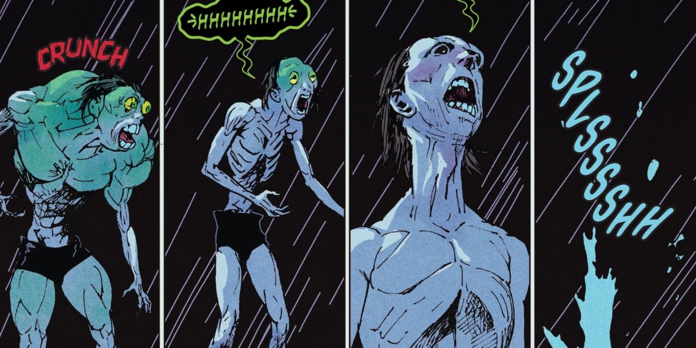 Después de que la bestia es asesinada y Swamp-Thing desaparece, Hulk está listo para ceder el control del cuerpo físico compartido a Banner. Al hacerlo, Hulk hace que el proceso de transformación sea absolutamente horrible (como se ve en secuencia en las imágenes que aparecen arriba y abajo).
