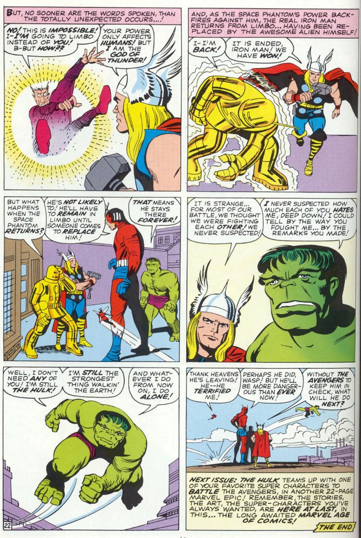en 1963 Avengers 2, escrito e ilustrado por los legendarios Stan Lee y Jack Kirby, el Space Phantom llega a la Tierra en un intento por conquistarla. El Fantasma Espacial puede cambiar su forma y cuando asume la forma de alguien, esa persona es desterrada al Limbo mientras el Fantasma se hace pasar por ellos. Se hace pasar por Hulk y ataca a los Vengadores. Durante el transcurso de la batalla, los compañeros de equipo de Hulk revelan lo que realmente sienten por él, incluido Iron Man. Le dice a Hulk que tenía reservas acerca de que se uniera a los Vengadores, y esto lo confirmó. Cuando el verdadero Hulk regresa del limbo, ayuda a los Vengadores a derrotar al Fantasma espacial, que es desterrado a su propia prisión. Después de la batalla, Hulk, ahora que sabe lo que sus compañeros Vengadores sienten por él, deja al equipo enojado.