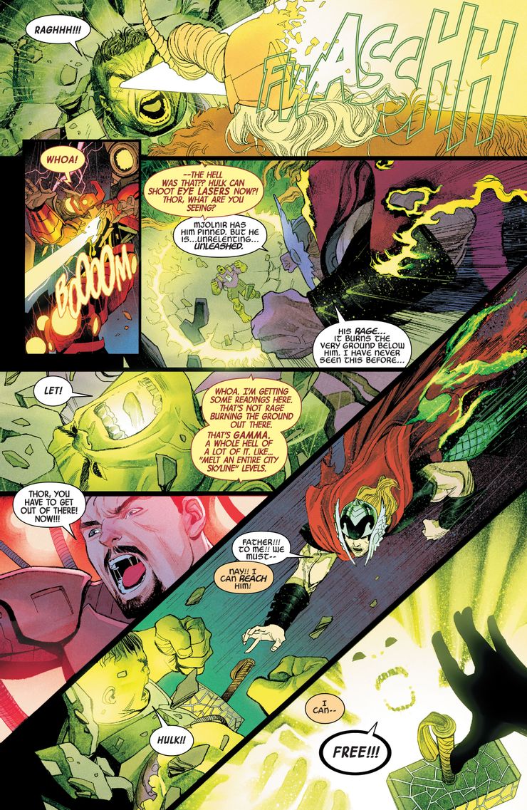 En hulk #7, Escrito por Donny Cates con arte de Martin Coccolo, Hulk logra liberarse de Mjolnir. Odin, cuya alma se encuentra actualmente dentro de Mjolnir, decide atrapar a Hulk con la esperanza de hablar con Bruce Banner. Lo que no espera es que la furia de Hulk arda con tanta fuerza que literalmente explote. Su rabia por ser inmovilizado quema el suelo a su alrededor, y Hulk finalmente explota con la fuerza de tres mil bombas gamma, escapando efectivamente de Mjolnir. Además, en Hulk contra Thor: Estandarte de Guerra Alfa #1, también escrito por Donny Cates con arte de Martin Coccolo, la decisión incondicional de Hulk de empujar contra Mjolnir le permite escapar; Mjolnir se desgarra directamente a través de su cuerpo, pero Hulk es muy consciente de que podrá curarse.