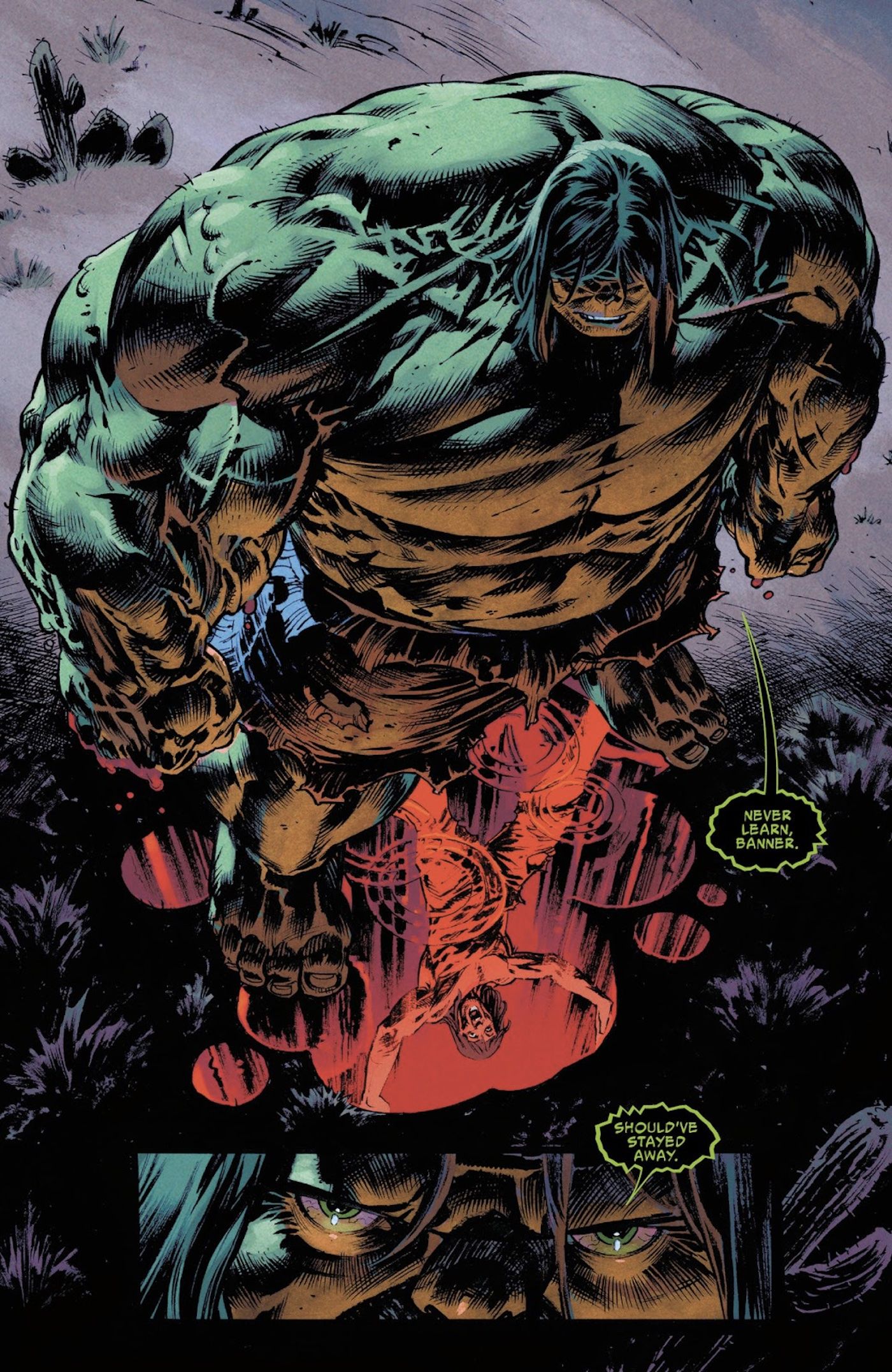 Philip Kennedy Johnson, Nic Klein y Matthew Wilson El increíble Hulk (2023) #6 continúa con Banner y su nuevo compañero Charlie caminando por un camino a través del desierto en un intento de llegar a la siguiente ciudad. Aunque los granjeros los recogen y los llevan a su campamento para pasar la noche, Banner sale corriendo presa del pánico cuando Hulk comienza a tomar el control sin ningún aviso o advertencia.