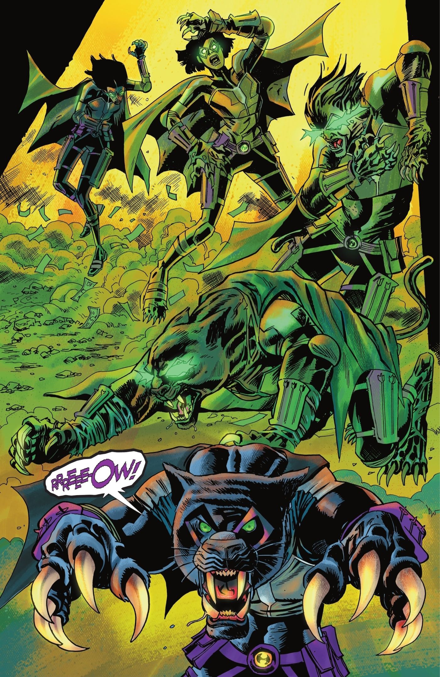 El evento Beast World de DC está en pleno apogeo y las esporas de bestias de Chico Bestia están lloviendo por todo el mundo. Mientras persigue a un funcionario municipal corrupto en la historia “Garra y orden” de Sam Maggs, PJ Holden y Lucas Gattoni de Titanes: Gira mundial de las bestias – Gotham #1, Helena Bertinelli termina siendo infectada por una espora de bestia, que la transforma en una verdadera Cazadora: una pantera.