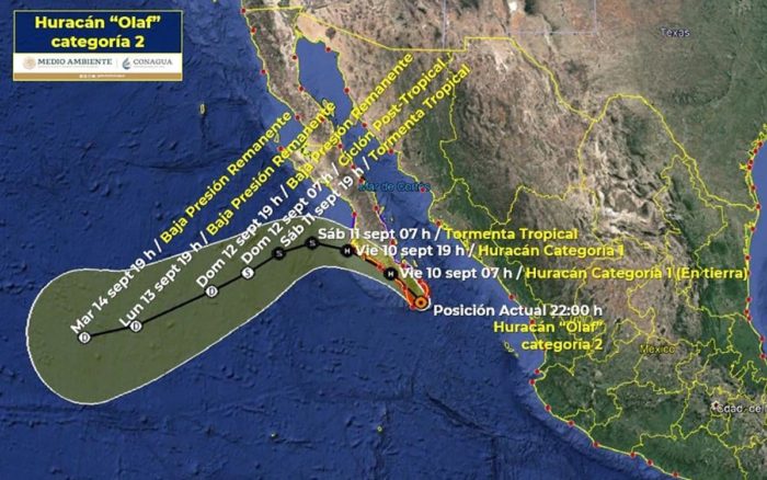 El huracán ‘Olaf’ tocó tierra alrededor de las 21:00 horas del jueves en las inmediaciones de San José del Cabo, Baja California Sur, como huracán categoría 2 en la escala de Saffir-Simpson, con vientos máximos sostenidos de 155 kilómetros por hora y rachas de 185 kilómetros.