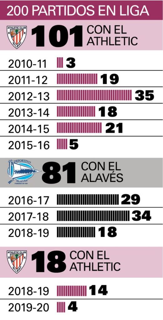 Dos temporadas y media en el Alavés y más de siete en el Athletic, pero la diferencia a nivel de partidos con uno y otro club no es tan sustancial.