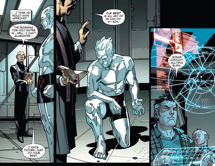 En X Men vol. 3 #5, de Victor Gischler, Paco Medina, Juan Vlasco y Marte Gracia, la base de los X-Men, Utopía, está bajo ataque. Cyclops prepara a los mutantes de “piel dura” (Emma Frost, Colossus y Husk entre sus filas) para la batalla contra el ejército de vampiros de Xarus. Mientras tanto, Iceman está pasando por un importante ritual que les dará la ventaja que necesitan. En una epifanía inspirada en las creencias católicas de Nightcrawler, Cyclops se da cuenta de algo vital acerca de Bobby Drake: Iceman está hecho de agua. Al pedir la ayuda de un sacerdote católico, Iceman recibe una bendición. El hielo que cubre su cuerpo se convierte en agua bendita, que luego usa para incinerar a los vampiros, consumiéndolos en un maremoto helado.