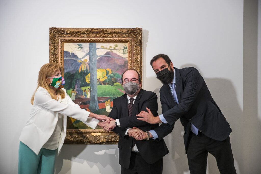 Frente a la obra del impresionista Paul Gauguin, que regresó el pasado lunes 7 al museo tras pasar casi dos años en un búnker de Andorra, lugar de residencia de Cervera y su hijo, ambos se han entrelazado las manos con el ministro de Cultura y Deporte, Miquel Iceta, que ha sido el responsable de cerrar y firmar un acuerdo alcanzado en enero de 2021, cuando ostentaba el cargo José Manuel Rodríguez Uribes. Tras unos minutos rubricando las 68 páginas del documento, han llegado las buenas palabras entre dos firmantes que llevan 22 años en más desacuerdo que sintonía. Cervera ha recordado el deseo de su marido, el barón Hans Heinrich von Thyssen-Bornemisza, del que heredó gran parte de su colección, de ver unidas dos colecciones en la pinacoteca que tardó, según sus propias palabras, “ocho años en conseguir libre de herederos”. La baronesa, muy emocionada durante su discurso, casi hasta las lágrimas que se ocultaron bajo su mascarilla inspirada en Mata Mua, ha cerrado su intervención con estas palabras: “A mi muy querido Heini le dedico esto, él quería ver esto unido”.