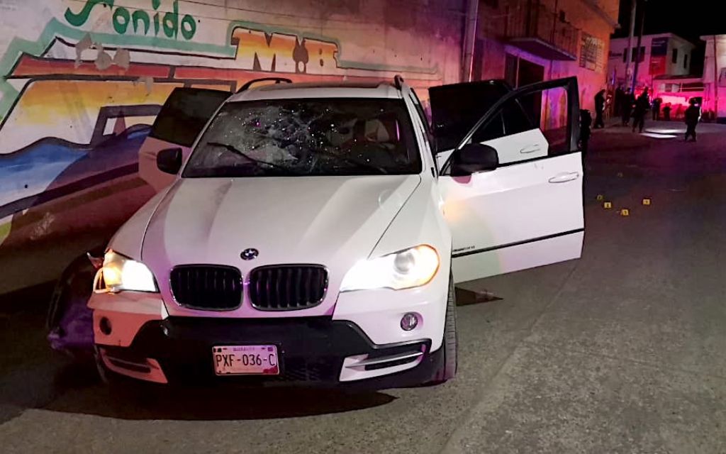 En el lugar ubicaron una camioneta marca BMW tipo X-5, de color blanco, con placas de circulación PXF-036-C del Estado de Morelos, con las puertas abiertas, a bordo de la cual se localizaron los cuerpos sin vida de tres adultos, uno del sexo femenino y dos del sexo masculino, quienes presentaron lesiones penetrantes a consecuencia de disparos de proyectil de arma de fuego.