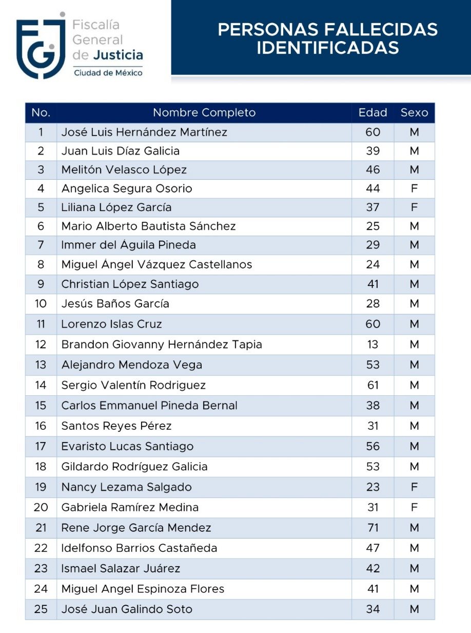 La Fiscalía General de Justicia de la Ciudad de México (FGJCDMX) informó que identificó a 25 personas fallecidas tras el colapso del tren de la Línea 12 del Metro, en un puente del tramo entre las estaciones de Olivos y Tezonco, lo que elevó la cifra de muertos reportada durante las últimas horas.