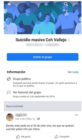 “Banda, este pedo es el 20 de este mes, los que se quieran suicidar pidan información inbox”, se leía en el mensaje que Ángel publicó en un grupo que creó en Facebook, llamado “suicidio masivo CCH Vallejo”.