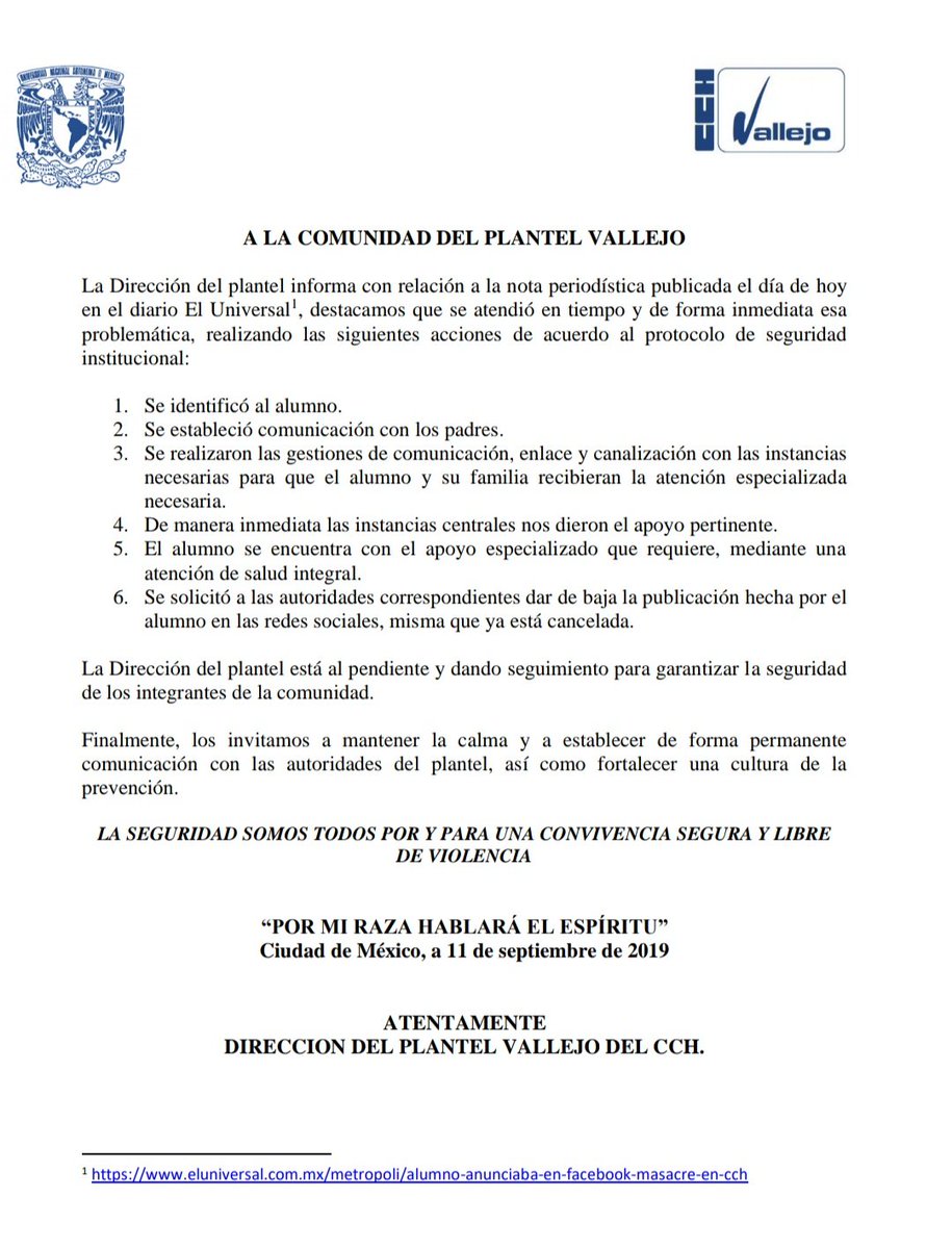 La Dirección del Colegio de Ciencias y Humanidades (CCH) Vallejo informó que se identificó al alumno que anunció por la red social Facebook que el 20 de septiembre realizaría una masacre en ese plantel y después se suicidaría.